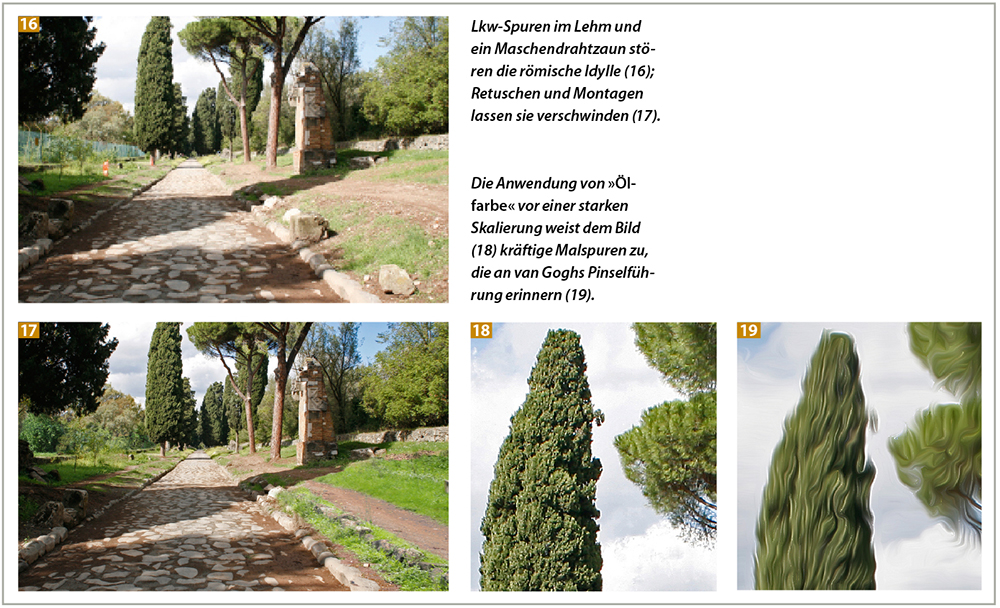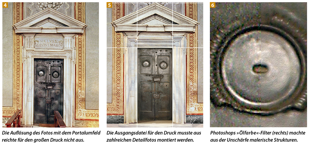 Nach vielen Montage- und Retuscheschritten war ich mit dem Ergebnis [17] zufrieden. Aus den genannten Unschärfe-Gründen setzte ich auch hier Photoshops »Ölfarbe« ein [18 und 19], und zwar – anders als bei der Sancta-Sanctorum-Tür –, bevor ich das Bild auf die finale Größe skalierte. So ist die – später stark nachgeschärfte – malerische Struktur besonders gut erkennbar.