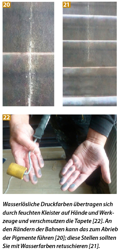 Die verwendete Tapete [8] ist vorgekleistert; sie muss also nicht per Hand mit Tapetenkleister bestrichen werden, sondern nur 15 bis 20 Sekunden gewässert werden. Das geht mit einer nassen Farbwalze – besser funktioniert allerdings das Eintauchen in eine gefüllte Wanne. Die leicht glänzende Oberfläche erlaubt das Aufstreichen und Andrücken mit der Hand, danach mit einer Tapezierbürste und vor allem an den Rändern mit einer Gummiwalze [2 und 9].