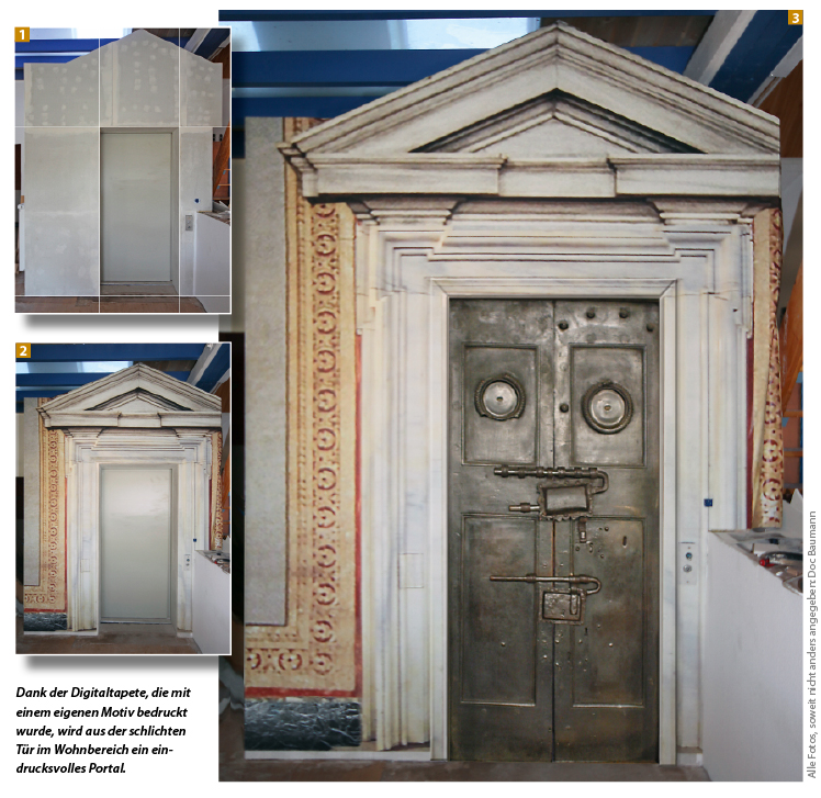 Das Bild wurde ebenso wie das auf der gegenüberliegenden Seite vorgestelltevon der Bremer Firma prints-compudruck angefertigt. Als Tapetenmaterial setzte sie „Wallpaper Persomural 170 matt 3260“ sowie „Prepasted WallpaperSol Persomural 225“ des Papierherstellers Sihl ein; gedruckt wurde mit „HP Vivera 91“-Tinte auf einem „HP Z 6100“-Drucker.