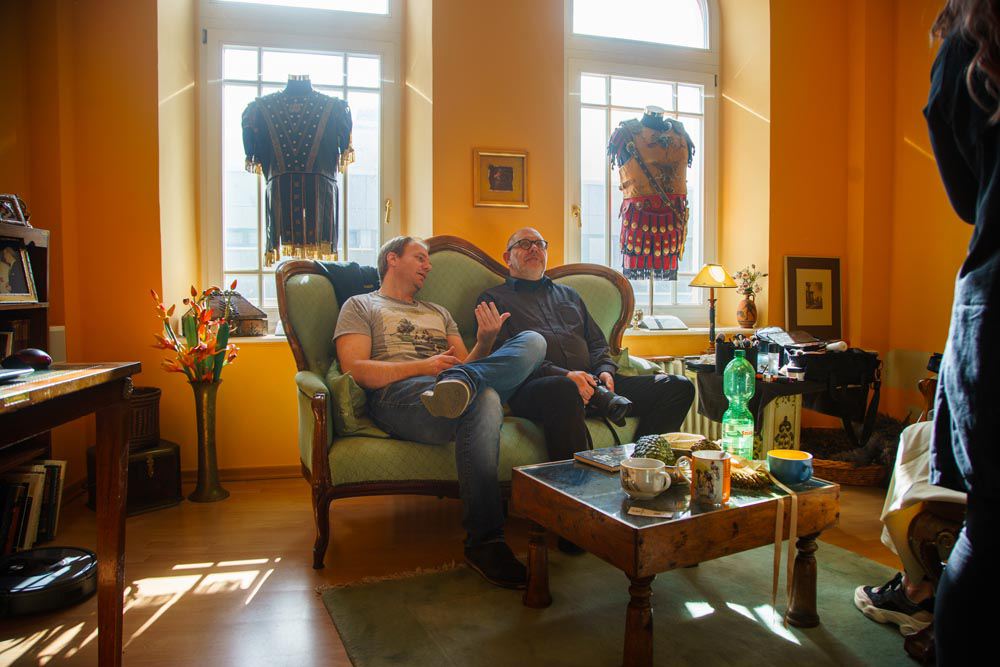 Im Bild bin ich mit Alberto zu sehen. Erste Szeneneinstellungen werden besprochen und mögliche Gesten eruiert. Im Hintergrund entsteht die Kulisse mit passenden und ausschmückenden Objekten in Anlehnung an diese Zeit.