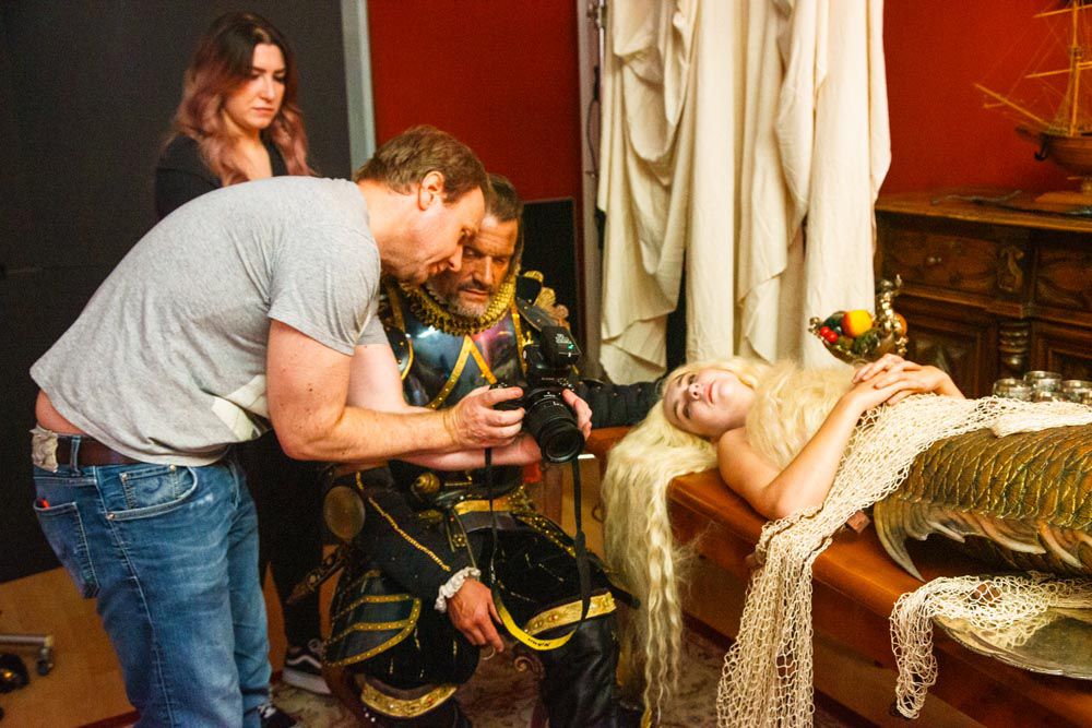 Ich erkläre an Hand der ersten Bilder, wie ich die Positionen besser haben möchte und wie das Licht später digital nachbearbeitet wird. Gemeinsam wird besprochen, die Szene noch emotionaler darzustellen. Für mich ist es wichtig, dass sich Statisten und Models in das Gesamtkonzept mit einbringen, denn nur so entsteht am Ende das perfekte Bild aus meiner Sicht.