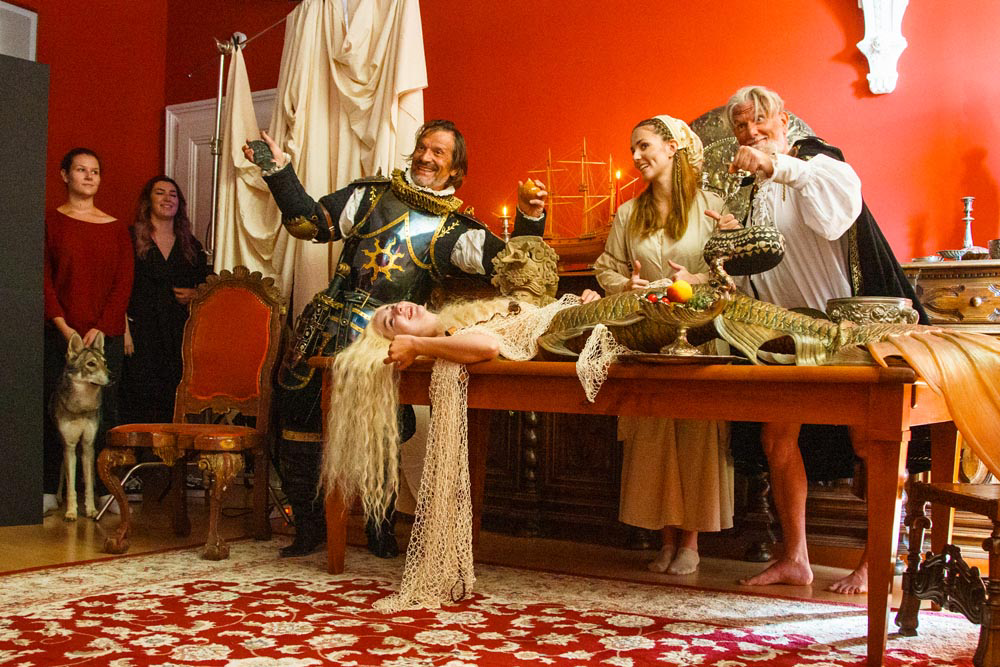 Gute und authentische Requisiten sind das A und O einer gelungenen Inszenierung. Ein Holzmodellschiff, nicht aus dem Katalog, ein silberner Lüster, ein Prunkschild. Alles wird folgend arrangiert um das gewünschte Ambiente zu erschaffen.