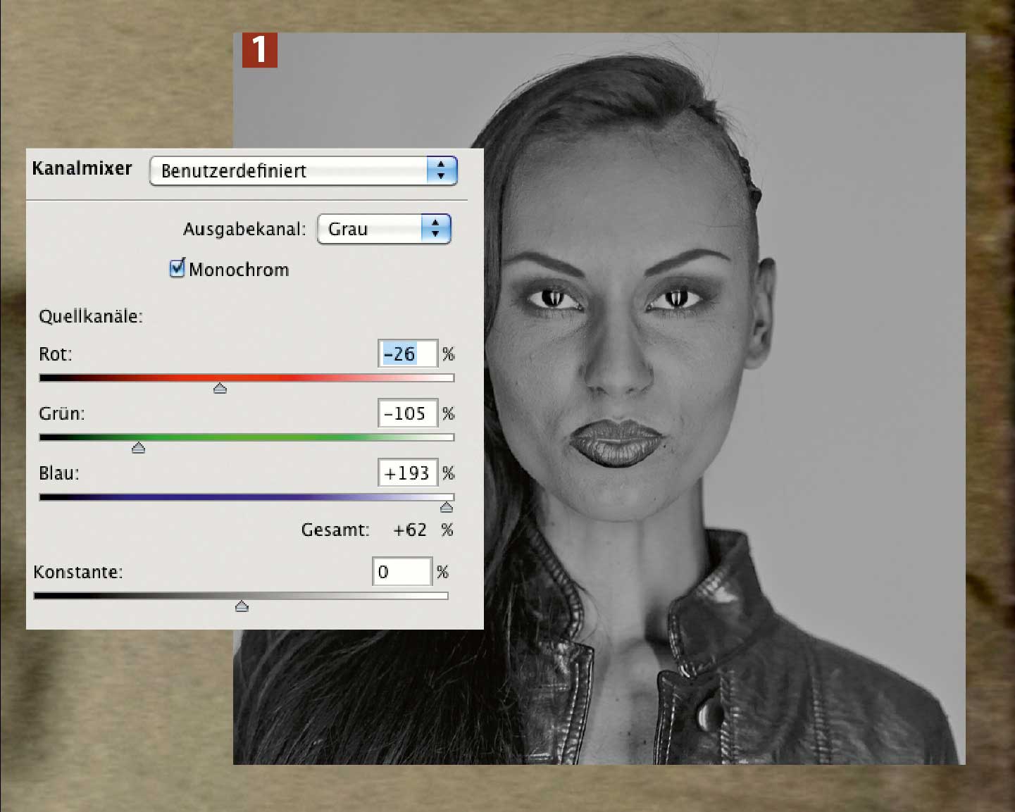 unter www.docma.info/10259.html gibt. Das Farbbild wird mit hohem Blaukanal-Anteil in eine dunkle Schwarzweißversion umgewandelt.
