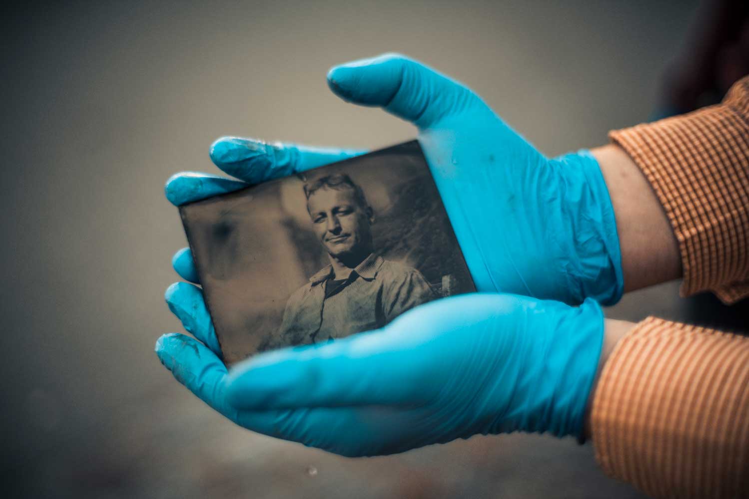 Wenn der Fotograf Thomas Kretschel im Auftrag von Redaktionen und andere Kunden zwischen Sachsen und Afrika unterwegs ist, arbeitet er mit aktuellen Nikon-DSLRs. Seine Leidenschaft für ursprüngliche Fotografie-Verfahren inspirierte ihn dazu, einen Wohnwagen aus DDR-Produktion zu einem Fotolabor auszubauen, in dem er über Land reist, um Menschen und Landschaften auf mit Silber und Kollodium beschichteten Metall- oder Glasplatten festzuhalten. Holger Lübbe pflegt die alten Techniken des Lichtdrucks und der analogen Fotografie in der offizin darmstadt. Er hat ein ungewöhnliches Spektrum beruflicher Qualifikationen, denn neben seiner Haupttätigkeit als Kommunikationsdesigner ist er auch ausgebildeter Rettungssanitäter und Schreiner.