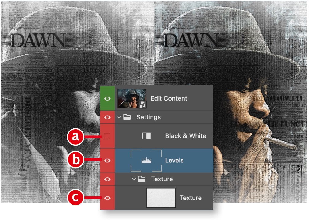 Farbbilder werden durch die Einstellungsebene vom Typ »Schwarzweiß« in Graustufen umgewandelt (a). Möchten Sie etwas Farbe beibehalten, blenden Sie die Ebene mit einem Klick auf das Augen-Icon aus. Alternativ fügen Sie eine Ebenenmaske hinzu und malen in dieser mit schwarzer Farbe, um nur selektiv die Farbe zurückzubringen. Die zweite Einstellungsebene namens „­Levels“ ist eine »Tonwertkorrektur« (b), mit der Sie den Kontrast des Bildes anpassen. Der Ordner „Texture“ enthält eine Ebene mit dem gleichen Namen, die dem Bild eine Papierstruktur im Modus »Multiplizieren« überlagert (c). Senken Sie die »Deckkraft« der Ebene, falls Ihnen der Effekt zu kräftig erscheint.