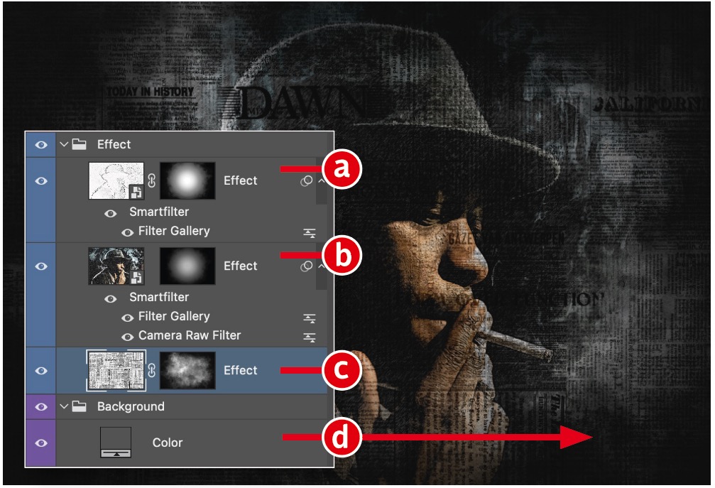 Der grundlegende Bildeffekt wird durch die Ebenen in der Gruppe „Effect“ erzeugt. Die oberste Ebene (a) erzeugt mit dem Filter »Fotokopie« eine Konturenumsetzung des eingefügten Fotos und überlagert diese Konturen im Modus »Abdunkeln«. Die zweite Ebene (b) optimiert über den »Camera Raw-Filter« ausgeprägt den Bildkontrast und die Schärfe. Wegen dieses Filters funktioniert das Mock-up nicht in alten Photoshop-Versionen wie CS6 und früher. Als weiterer Filter kommt hier die »Strichumsetzung« zur Anwendung, die das Bild wie gezeichnet wirken lässt. Die dritte Ebene (c) überlagert die Textelemente. Eine interessante Bild­variante erzeugen Sie durch Wählen einer dunklen Farbe für den Hintergrund (d).