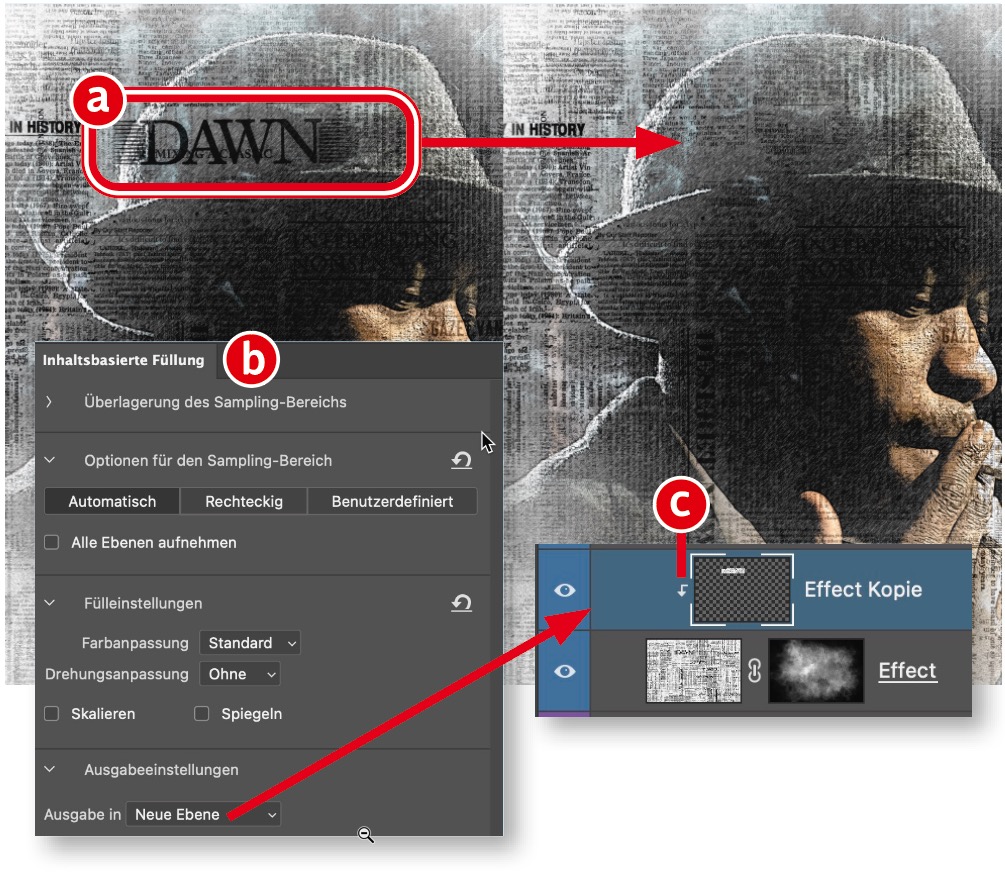 Da alle Textzeilen zu einer Ebene (3c) zusammengefasst worden sind, haben Sie auf deren Inhalt keinen Einfluss. Es geht bei dem Mock-up aber auch nicht darum, die Textinhalte zu lesen. Insbesondere der große „Dawn“-Schriftzug (a) kann je nach Motiv störend ins Auge fallen. Schnell und unkompliziert entfernen Sie ihn über »Bearbeiten > Inhaltsbasierte Füllung«: Aktivieren Sie die Ebene (3c), deaktivieren Sie mit Shift-Klick deren Ebenenmaske und wählen Sie mit dem »Lasso« den zu entfernenden Schriftzug aus. Den anschließend aufgerufenen Dialog »Inhalts­basierte ­Füllung« (b) bestätigen Sie ohne jede Änderung mit »OK«. Erzeugen Sie mit »Strg/Cmd-Alt-G« eine Schnittmaske (c) für die neue Ebene und aktivieren Sie wieder die Maske der Ebene mit den Textelementen, indem Sie sie anklicken.
