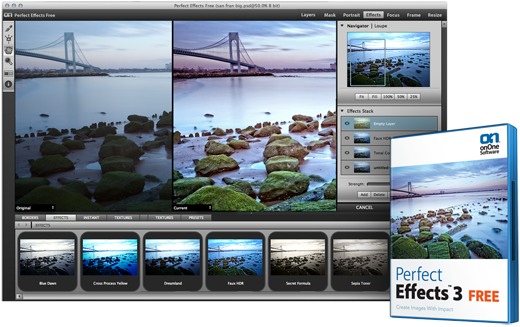 onOne Software hat eine kostenlose Version der sowohl eigenständig als auch in Verbindung mit Photoshop, Photoshop Elements, Lightroom oder Aperture lauffähigen Effektsoftware Perfect Effects 3 bereitgestellt. Sie bietet nahezu den gleichen Funktionsumfang wie das kommerzielle Perfect Effects 3 zum Preis von 100 USD, die Auswahl der verfügbaren Effekte ist jedoch auf 25 von 337 begrenzt. Beide Versionen verfügen über eine Vollbild-Vorschau, Maskierungswerkzeuge, Regler für die Effektstärke und die Möglichkeit, Effekte miteinander zu kombinieren sowie eigene Voreinstellungen zu speichern.