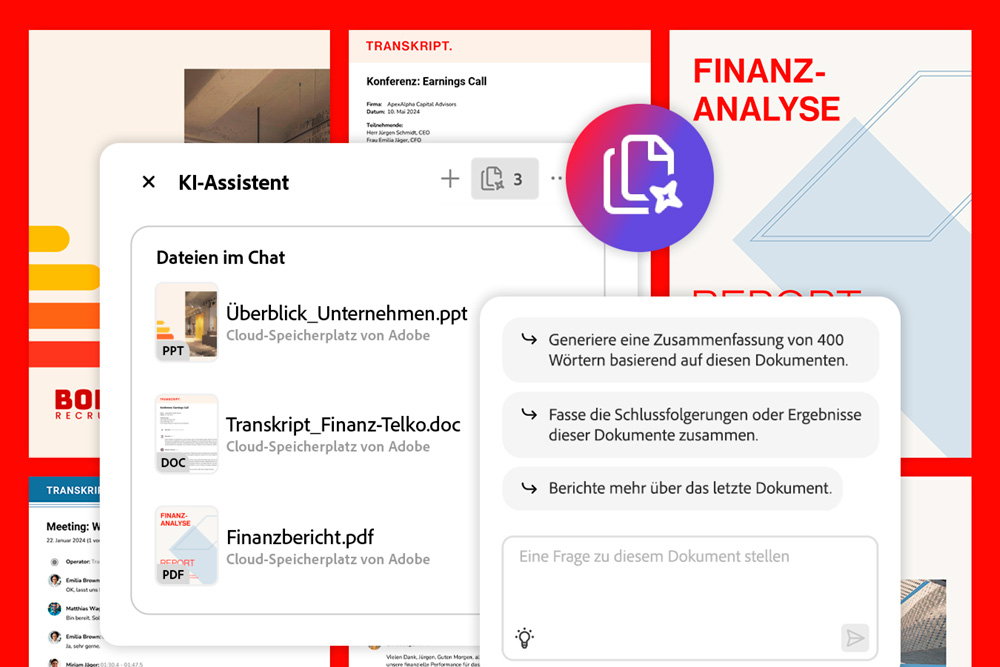 Adobe hat den Acrobat KI-Assistenten vorgestellt, der jetzt auch auf Deutsch verfügbar ist, also Prompts in deutscher Sprache versteht. Diese neue generative KI-gestützte Konversations-Engine in Adobe Acrobat und Reader soll Anwendern die inhaltliche Analyse von PDF-Dateien und anderen Dokumenttypen wie Word, PowerPoint und Textdateien deutlich erleichtern – sowohl auf Desktop-Computern, im Web als auch auf mobilen Endgeräten. Der KI-Assistent kann Dokumente zusammenfassen, Schlüsselthemen identifizieren und Antworten auf inhaltliche Fragen liefern.