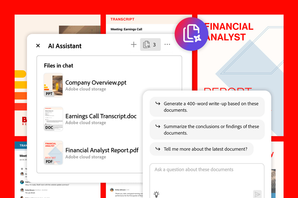 Neu ist auch der Acrobat AI Assistant (deutsch: Acrobat KI-Assistent), eine tief in Reader- und Acrobat-Workflows integrierte Konversations-Engine, die es Anwendern ermöglicht, Fragen an Dokumente zu stellen, Inhalte zu analysieren und Entwürfe zu erstellen. Dabei werden Informationen aus PDFs sowie anderen Dokumenttypen wie Word, PowerPoint und Textdateien zusammengefasst.