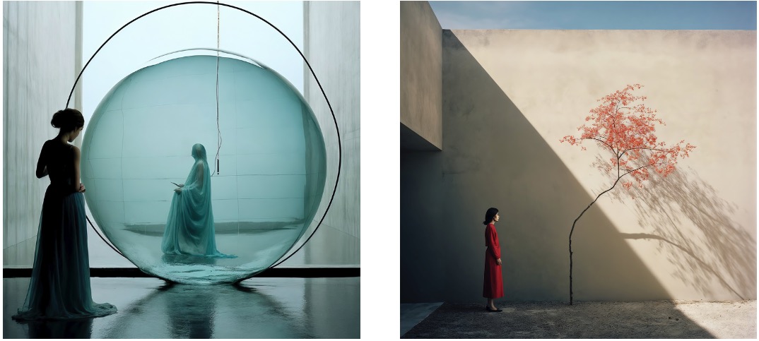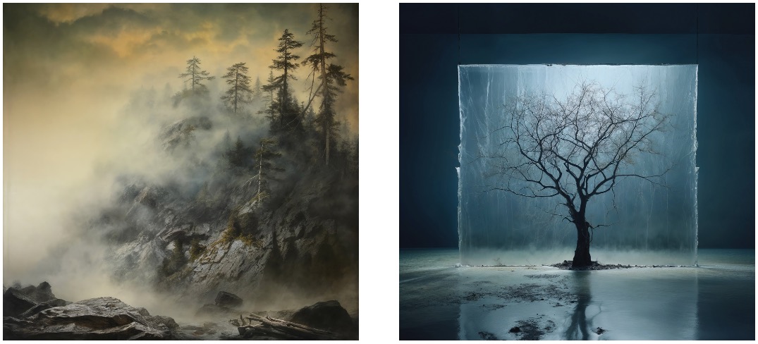 Ohne Zusätze eingegeben, kamen trotz medienneutraler Beschreibung und trotz Verzicht auf Nennung des Malers oder des Titels immer Bilder heraus, die eine eher malerische Anmutung aufwiesen und alles andere als zeitgemäß wirkten. Ich entschied mich also, mittels eines Prompt-Präfixes jedes Motiv als zeitgenössische Kunstfotografie darstellen zu lassen. Um genauer herauszufinden, was Midjourney unter Kunstfotografie versteht, habe ich die KI angewiesen, die Prompts jeweils mit fünf unterschiedlichen Gewichtungen des Präfixes durchzurechnen. So entstanden von jedem der am Ende 56 Motive aus dem Werk des deutschen Romantik-Malers 20 Interpretationen in unterschiedlichen Abstraktionsgraden.