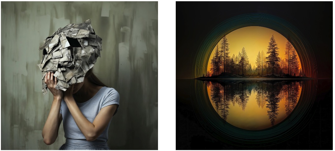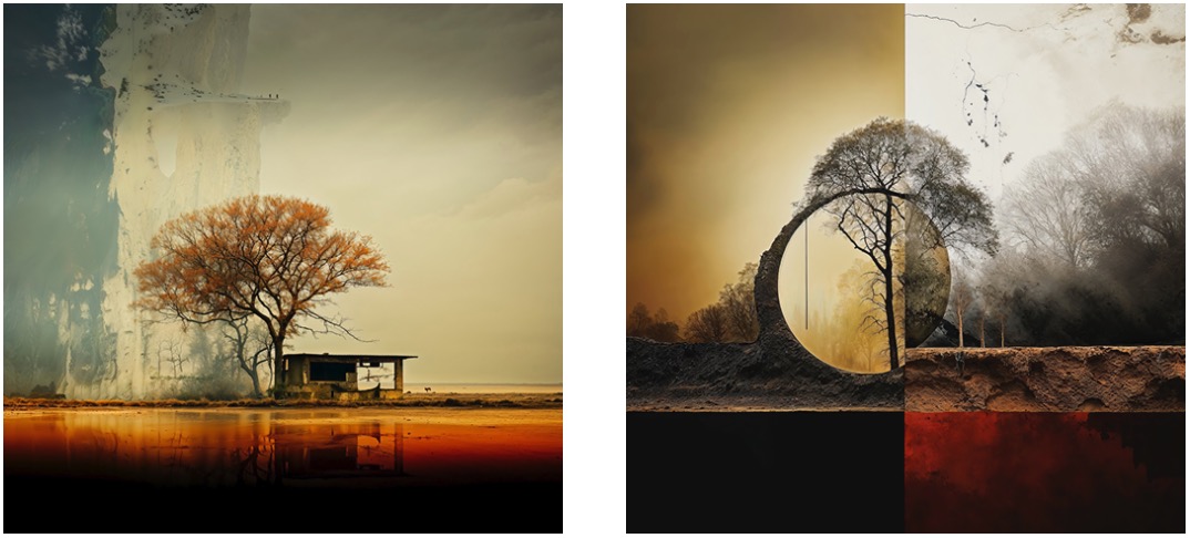 Nachdem ich über Wochen rund 50 Arbeiten dieser Art gepromptet hatte, zeigte ich das Konvolut einem befreundeten Medienkünstler. Seine Kritik war zwar sehr rücksichtsvoll formuliert, lautete aber auf den Punkt gebracht: zu verkopft im Ansatz und zu gefällig im Ergebnis. Auf die Frage, wie ich das Projekt retten könnte, hatte er eine einfache Antwort: Warum lässt Du nicht Bildbeschreibungen der Motive von der KI neu interpretieren? Auf diese Idee war ich auch schon gekommen. Ganz zu Anfang, und ich hatte sie verworfen. Mir gefielen die Ergebnisse damals überhaupt nicht.