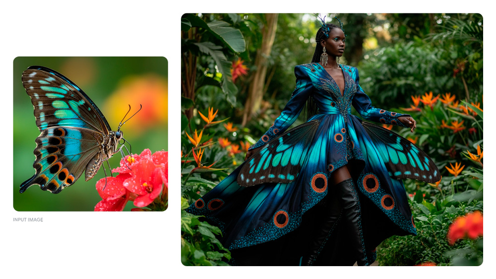 Mit Gemini 2.5 lassen sich zudem Stilelemente oder Texturen von einem Objekt auf ein anderes Bildprojekt übertragen. Die Software adaptiert etwa das Muster eines Schmetterlingsflügels und wendet es als Kleidermotiv an. Ebenso kann eine Interior-Aufnahme schrittweise verändert werden: Erst die Wandfarbe, dann Bücherregale, anschließend Möbel – ohne dass die KI den Kontext des Gesamtbilds verliert.