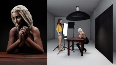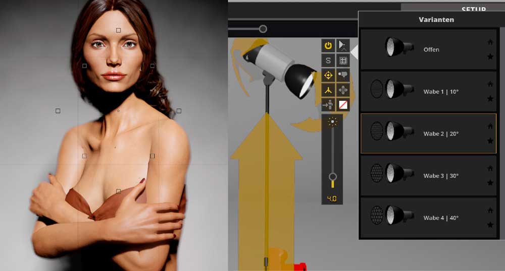 Ein Studiobitz Tutorial sollte mit einfachen Übungen beginnen. Wie fangen hier mal mit dem Hochfrontalen Licht an. Glücklicherweise ist das beim Lichtsetzen etwas einfacher und mit einer Lernumgebung wie Set.a.light 3D gehen die ersten Schritte unendlich viel schneller. Beginnen wir also zunächst mit einem Lichtsetting, das sich schon oft als schmeichelhaftes Porträtlicht bewährt hat. Man nennt das Hochfrontale Licht auch Marlene-Dietrich-Licht. Angeblich, weil die Filmdiva der 30er und 40er Jahre aus purer Eitelkeit darauf bestand, nur auf diese Weise – hochfrontal – ausgeleuchtet zu werden. Warum? Das werden wir später sehen.