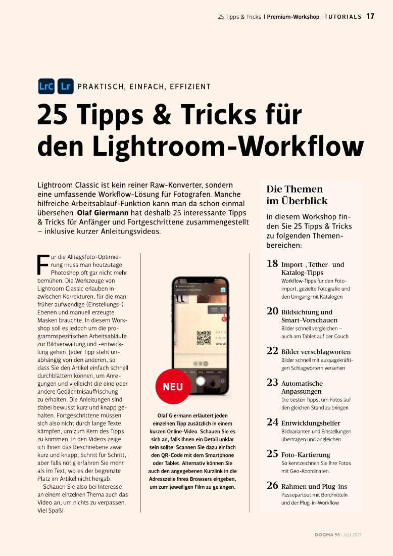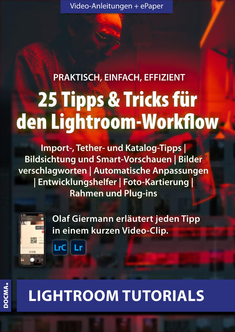 „25 Tipps & Tricks für den Lightroom-Workflow“, 12 Seiten E-Paper + 25 Video-Clips, ist hier im DOCMA-SHOP erhältlich.