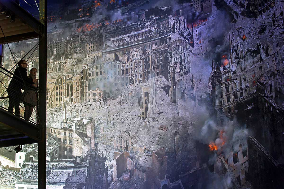 Im Maßstab 1:1 zeigt DRESDEN 1945 die Stadt nach den Bombenangriffen 1945. Von der 15 Meter hohen Besucherplattform erschließen sich die Ausmaße der Zerstörungen wie vor 70 Jahren vom Turm des stark beschädigten Rathauses. Etwa 30 Meter hoch und über 100 Meter im Umfang führt das Panorama auf eine emotionale Zeitreise, die zum Nachdenken anregt. Die einführenden multimedialen Rauminstallationen schlagen den Bogen der Stadtgeschichte von etwa 1900 über die Zeit des Nationalsozialismus bis hin in die Nachkriegszeit und lassen auch Zeitzeugen zu den Nachkriegstagen zu Wort kommen. DRESDEN 1945 thematisiert dabei nicht allein die Tragödie in Dresden, sondern verweist auf die Wechselwirkung in der kriegerischen europäischen Geschichte und damit auf Tragik und Hoffnung einer Stadt in Europa. Das Projekt verweist auch auf eine Vielzahl weiterer bombardierter Städte im Zweiten Weltkrieg – in Deutschland oder in anderen europäischen Ländern, die wie Dresden nach 1945 wieder aufgebaut wurden. Bewegende Eindrücke von der europäischen Metropole Dresden, dem „Florenz an der Elbe“, die Ereignisse im Nationalsozialismus, die alliierten Bombardierungen und die großflächige Zerstörung, dann der Wiederaufbau in der DDR, der Nachwende-Zeit und der Gegenwart – all diese Aspekte entlassen die Besucher aus dem Projekt 70 Jahre nach Ende des Zweiten Weltkriegs 1945.