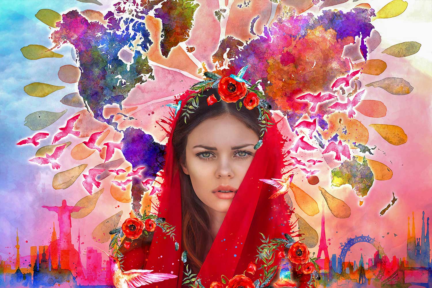 Für Laura Helena bedeutet Multilokalismus vor allem Freiheit und farbige Vielfalt. Zu ihrem Ausgangs-Motiv schreibt sie: „Ich blieb an dem wunderschönen jungen Mädchen mit dem roten Schal hängen. Sie hat einen intensiven Blick, der den Betrachter herausfordert, darüber nachzudenken, was Multilokalismus für ihn bedeutet.“ Dieses Bild verwandelte die Künstlerin mit verschiedenen bunten Elementen in ein Feuerwerk der Farben, das an das „Holi Festival of Colors“ erinnern soll.
