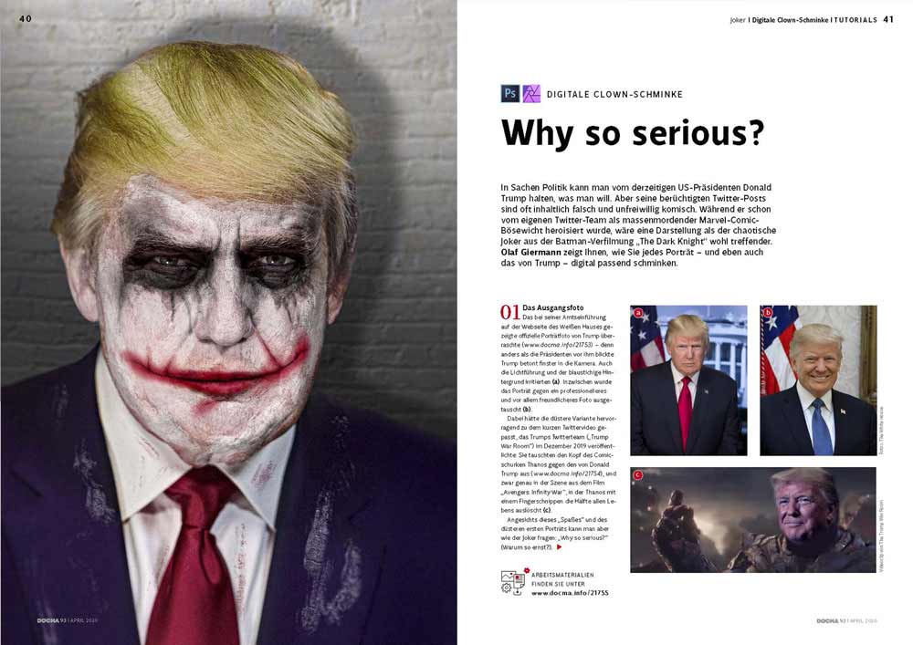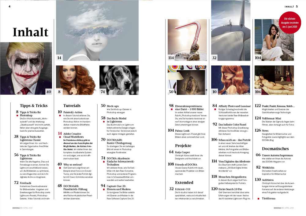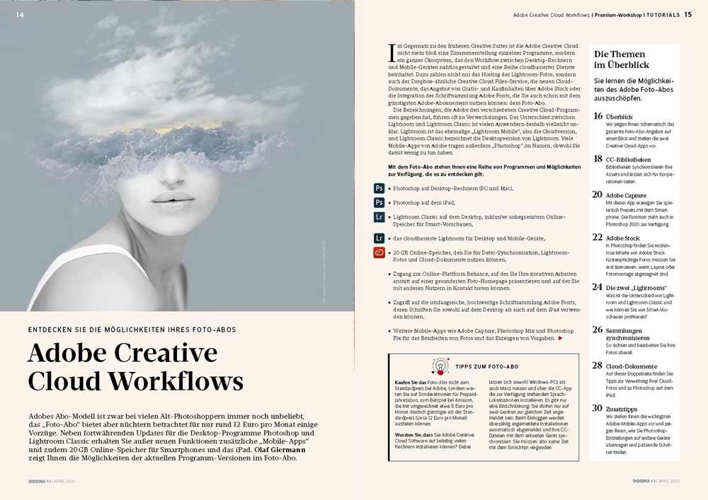Eine der vorgestellten Digital Artists ist Natalie Shau. Die Litauerin steht für eine surreale Porträtkunst, in der sie die zugrunde liegenden Fotos mit Photoshop und Wacom-Grafiktablett in Bilder mythischer Wesen verwandelt. In einem Step-by-Step-Tutorial mit detaillierten Anleitungen und eingebetteten Filmen zeigt Natalie Shau, wie aus einem Selbstporträt und einigen weiteren Fotos eine Harpyie entsteht, ein unheimliches Mischwesen aus Vogel und Frau, wie es schon von Homer in der Odyssee beschrieben wird. In ihrem Tutorial führt Natalie Shau von der Retusche des Gesichts über die Montage von Flügeln und Federn sowie dem Aufbau des Hintergrunds bis zu den finalen Optimierungen.