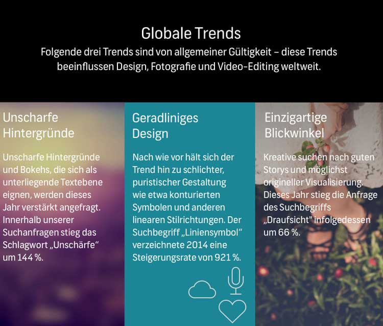 In Deutschland sind vor allem Bilder im Instagram-Stil sowie Infografiken gefragt. Weltweit beobachtet shutterstock drei wesentliche Trends in den Bereichen Design, Fotografie und Video-Editing: „Unscharfe Hintergründe“, „Geradliniges Design“ und „Einzigartige Blickwinkel“. So wurden unscharfe Hintergründe und Bokehs verstärkt nachgefragt; die Zahl der Suchanfragen nach „Unschärfe “ stieg laut shutterstock um 144%. Der Suchbegriff „Liniensymbol“ verzeichnete 2014 eine Zunahme um 921%, Ausdruck des Trends zu einem schlichten Gestaltungsstil. Außerdem wurde verstärkt der Suchbegriff „Draufsicht“ verwendet, was nach Ansicht der Agentur ein Zeichen dafür ist, dass Kreative nach guten Storys und möglichst origineller Visualisierung suchen. Der Suchbegriff „Start-ups“ avancierte zum meistverwendeten Schlagwort bei Suchanfragen aus Deutschland, was laut shutterstock der boomenden Technologiebranche zu verdanken ist.