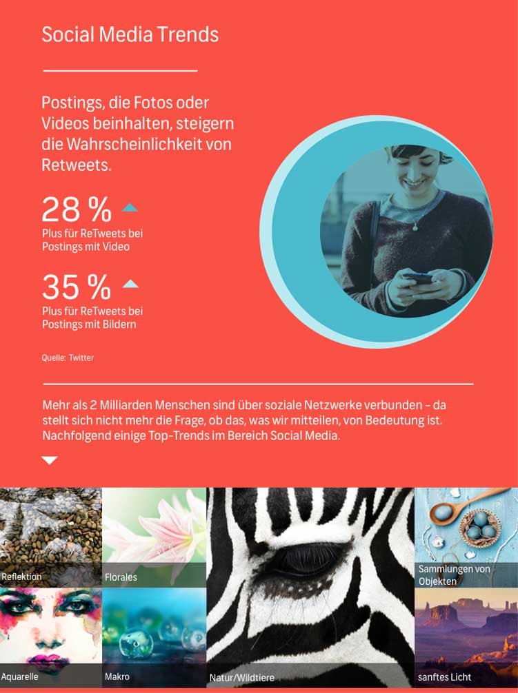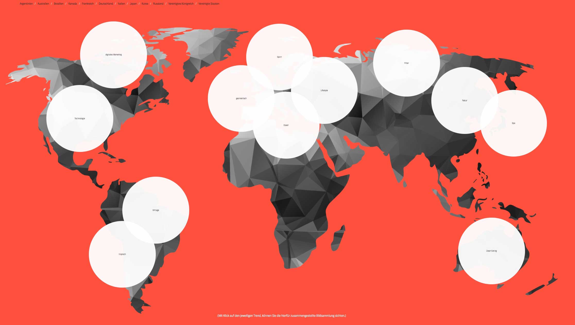 Mit einer interaktiven Infografik gibt die Bildagentur shutterstock einen Überblick über die kreativen Trends dieses Jahres. Die Grafik basiert auf der Nachfrage nach Bildern, Videos und Musikclips im vergangenen Jahr. Dafür wurden die Suchanfragen und Downloads, also die Nutzung der shutterstock-Datenbank, die aus mehr als 47 Mio. Bildern besteht, ausgewertet.
