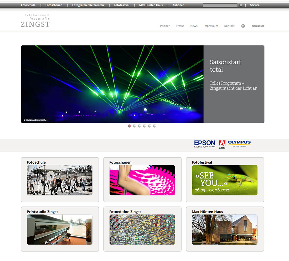 Auffallend an der neuen Internetseite ist die starke Bildsprache, die an der im Layout verwendeten Fotografie durchgängig zu erkennen ist. Raffinierte Verknüpfungen machen den Besuch der Site zu einem ästhetischen Genuss. Sildeshows und Karussellverbindungen lassen den Internetauftritt weit über das Normalmaß hinaus lebendig und unterhaltsam erscheinen. Die Erlebniswelt Fotografie, Zingst mitder Fotoschule Zingst, den Fotoschauen, dem Leistungskatalog des Printstudios und die ersten Hinweise auf die in diesem Jahr entstehende Fotoedition Zingst sind als attraktives, klar strukturiertes Angebot präsentiert.