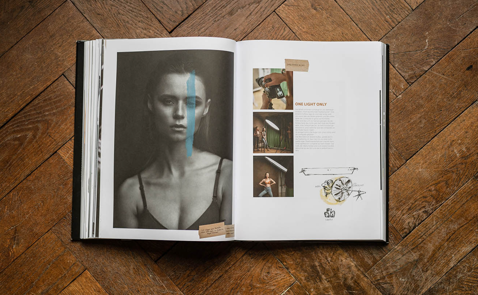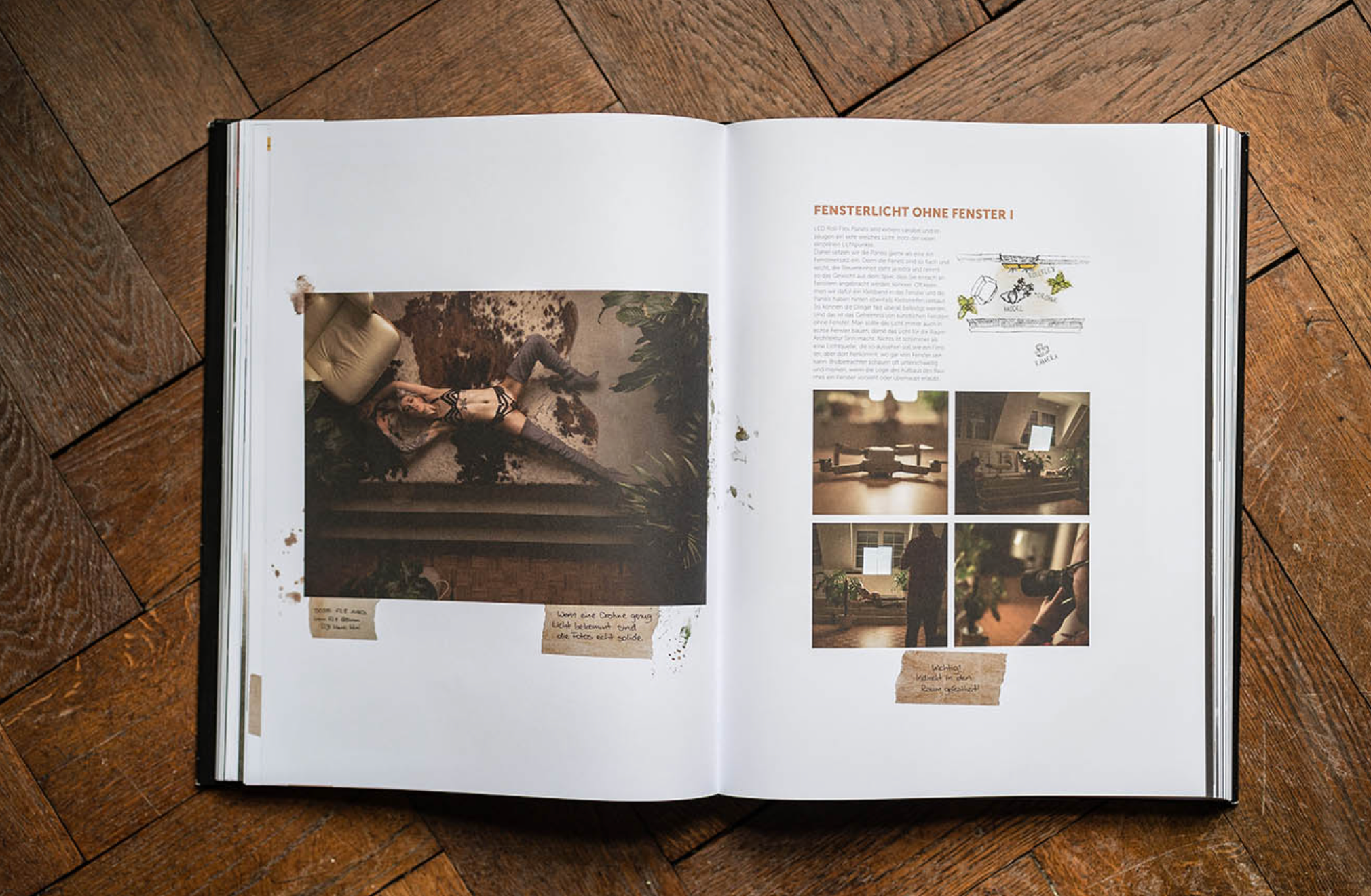 Es steckt sehr viel Liebe zum Detail und jede Menge Handarbeit in diesem Band. Der „Lehrband“, wie seine Schöpfer ihn nennen, ist eine Mixtur aus Lehrbuch und Bildband. Gedruckt auf 100 Prozent recyceltem Altpapier, geht es inhaltlich neben Fotos aus dem Bereich „Sensual Nude & Boudoir“ (übersetzt: ästhetisch-spärlich bekleidete jungen Frauen) vor allem um Anleitungen für die Ausleuchtung der gezeigten Motive. Begleitet wird dies von unzähligen handgezeichneten Elementen, die die Erklärungen verschönern.