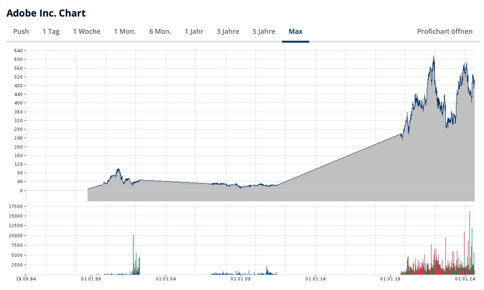 Betrachtet man die Entwicklung des Aktienkurses (hier seit 1999), wird deutlich, wie erfolgreich die Einführung des Cloud-Modells 2013 bisher war. Vielleicht ist bei so viel Wachstum die Community immer unwichtiger geworden.