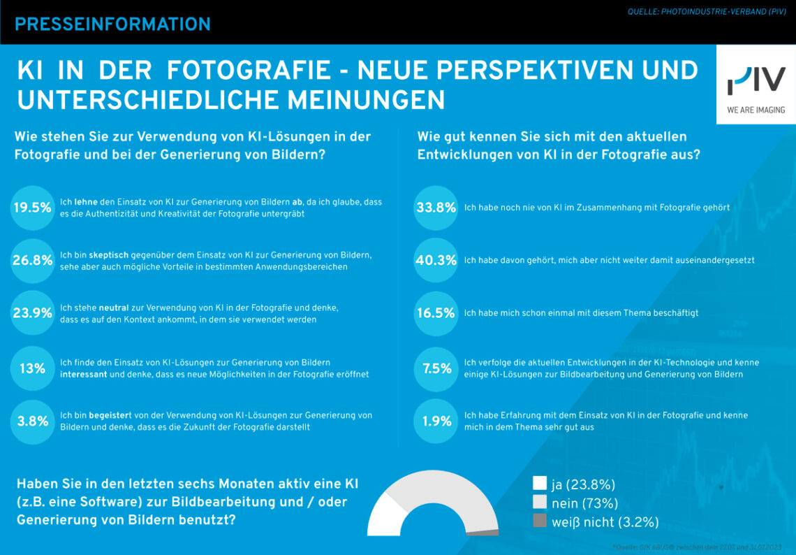 Die Meinungen in der gemeinsamen Umfrage des Photoindustrie-Verbands (PIV) und GfK sind geteilt: 19,5% lehnen allgemein den Einsatz von KI in der Fotografie als auch zur Bildgenerierung ab, da sie die Authentizität und Kreativität der Fotografie gefährdet sehen. 26,8% sind ebenfalls skeptisch, sehen aber mögliche Vorteile in bestimmten Anwendungsbereichen. Eine neutrale Position nehmen 23,9% ein, die der Meinung sind, dass es auf den Kontext ankommt, in dem KI eingesetzt wird. 13% finden den Einsatz von KI-Lösungen in der Fotografie interessant und sehen darin neue Möglichkeiten. 3,8% sind begeistert vom Einsatz von KI-Lösungen und sehen darin die Zukunft der Fotografie. Dabei sind es vor allem die jüngeren Befragten zwischen 18 und 39 Jahren, die Interesse oder Begeisterung für den Einsatz von KI-Lösungen zeigen (29,8% bei den 18-29-Jährigen und 21,8% bei den 30-39-Jährigen).