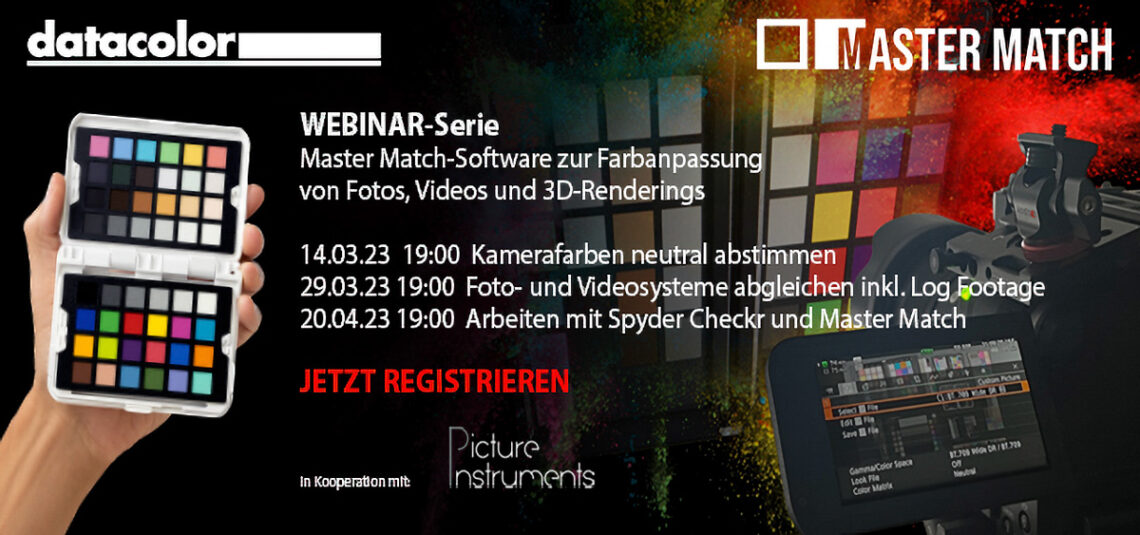 In Kooperation mit Picture Instruments bietet der Farbmanagement-Spezialist datacolor ab Mitte März 2023 drei kostenlose Webinare zum Thema Farbabgleich in Bild und Video an. Datacolor-Experte Boris Bergmann und Master Match-Erfinder Robin Ochs führen gemeinsam durch die kostenlose Webinarserie.