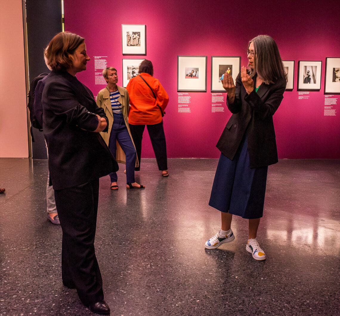 Nach dem D-Day begleitete Miller die alliierten Truppen in Frankreich, erlebte die Einnahme von Saint-Malo an vorderster Front und dokumentierte das befreite Paris. Mit dem Vormarsch der Amerikaner kam sie 1945 nach Deutschland, wo sie in dem am 11. April befreiten KZ Buchenwald und danach im KZ Dachau bei München fotografierte. Ihre Bilder der Toten und der knapp überlebenden Häftlinge werden in einem räumlich abgetrennten Teil der Ausstellung gezeigt, und hier hat sich Kathrin Baumstark ausnahmsweise für einen Warnhinweis entschieden – Triggerwarnungen nehmen in den Museen ja derzeit überhand, aber in diesem Fall ist dies angesichts einer auch für Kinder zugänglichen Ausstellung wohl angebracht. Eines der eindrücklichsten Fotos zeigt allerdings nicht das Grauen, sondern eine junge Frau im Dirndl, die von einem schwarzen GI durch das Lager geführt wird – die US-Army hatte die braven Bürger Dachaus gezwungen, sich genau anzuschauen, was jahrelang in ihrer Nachbarschaft geschehen war.
