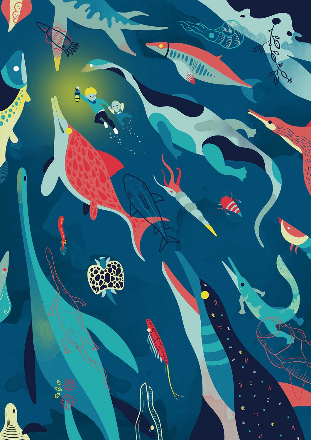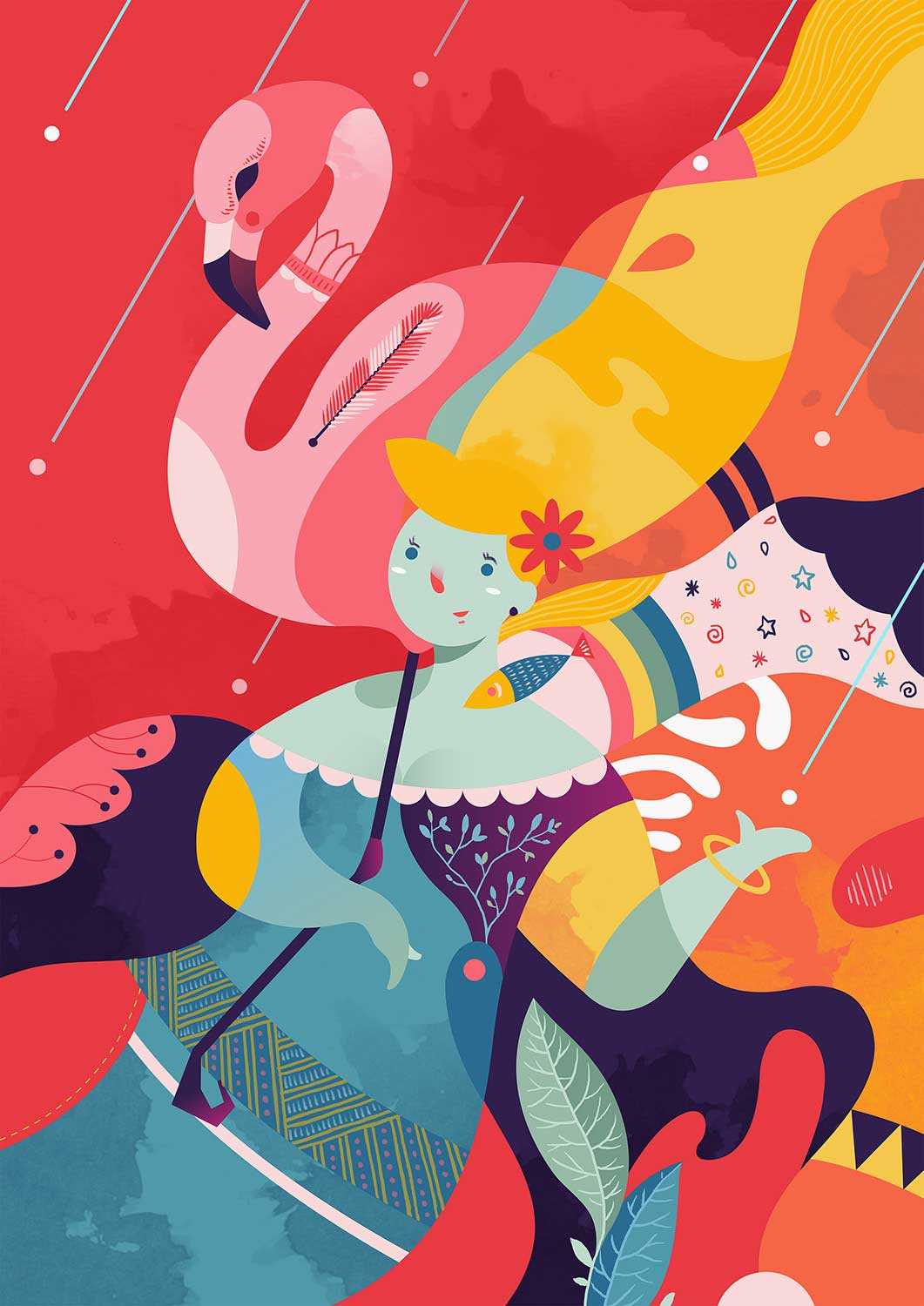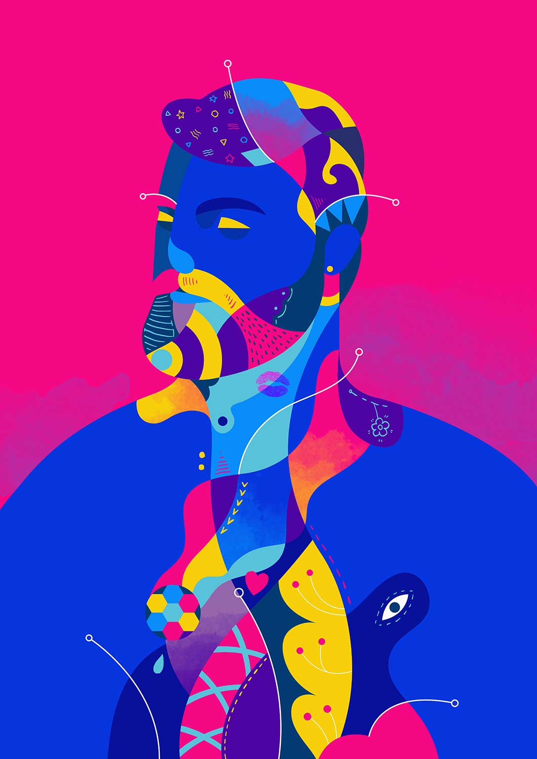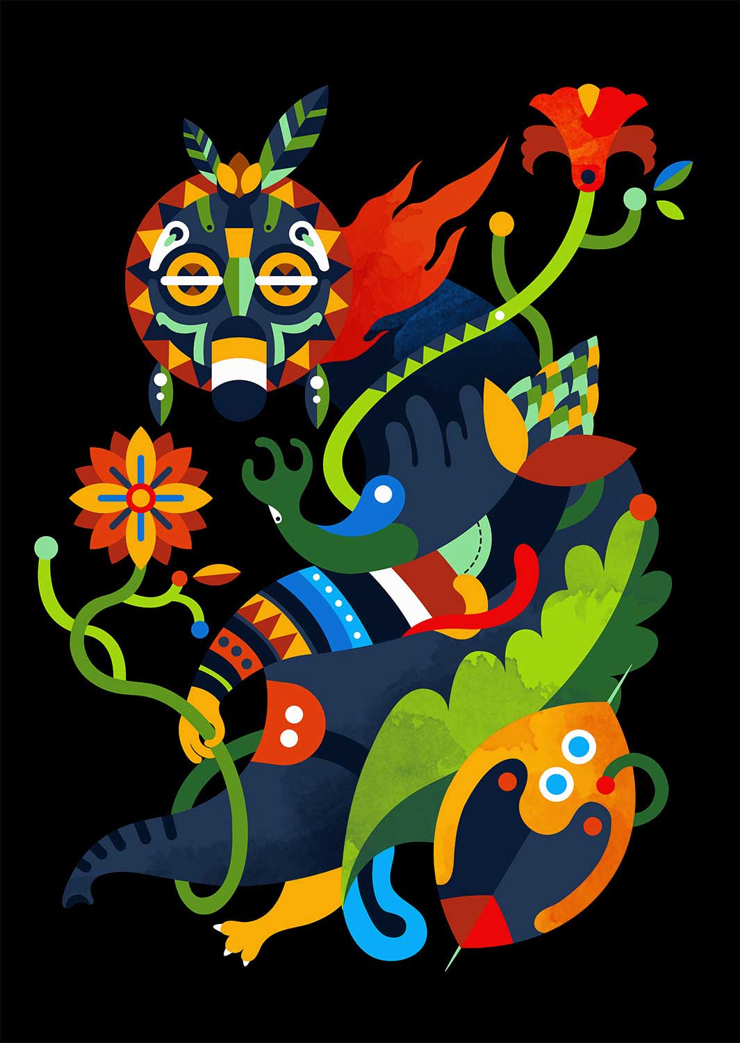 Die Studienzeit nutzte Jaye, um weiter an seinem persönlichen Stil zu feilen und ihn zu perfektionieren. „Ich zeichne gerne abstrakt und arbeite bei meinen Illustrationen meist mit verschiedenen Mustern und Texturen“, erzählt er. Zu seinen bevorzugten Motiven zählen vor allem Tiere, Natur und Monster, aber auch an „unvorstellbaren Geschichten“ – wie er selbst sie nennt – findet er großen Gefallen. Besonders auffallend sind neben den bunten, fantasievollen Motiven die knalligen Farben: „Die Farbauswahl ist mir sehr wichtig, denn farbige Arbeiten vermitteln sofort gute Laune“, so Jaye. Eine spezielle Inspirationsquelle nennt er nicht – vielmehr inspiriert ihn alles aus dem Leben, egal ob laut, ruhig, drinnen oder draußen.