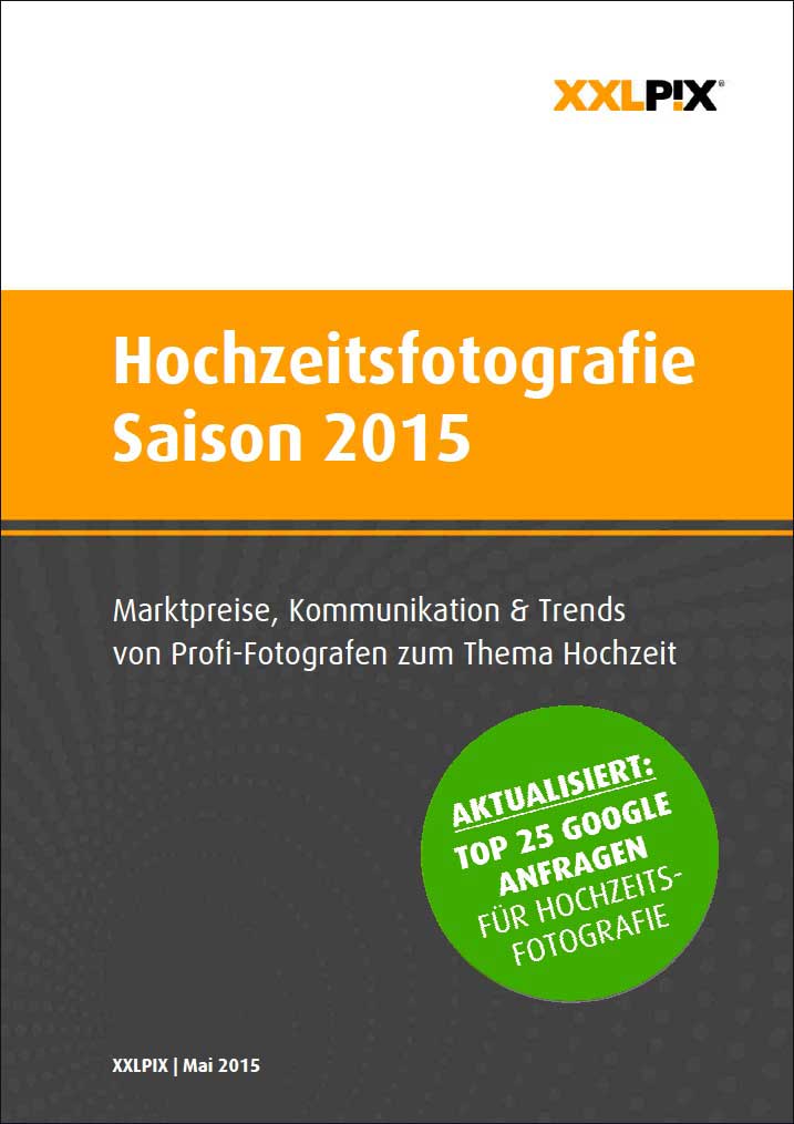 Das Profi-Fotolabor XXLPIX hat eine aktualisierte Ausgabe seines Marktreports „Hochzeitsfotografie“ zum kostenlosen Download bereitgestellt. Das 27-seitige PDF beinhaltet unter anderem aktuelle Trends in der Hochzeitsfotografie, die Marktpreise 2015 für professionelle Hochzeitsshootings, die 25 am meisten verwendeten Suchbegriffe im Internet, das Anfragepotential für über 100 Städte im Vergleich sowie Listen mit Hochzeitsmessen 2015/2016 und Internetadressen für Hochzeitsfotografie.