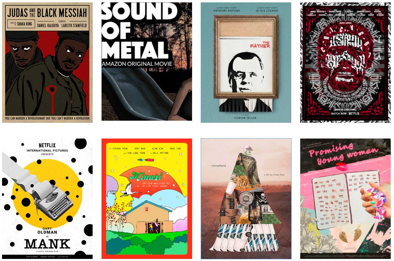 Die diesjährige Liste der nominierten Filme und Künstler, die die Designer neu interpretiert haben, umfasst: „The Father“, inspiriert von Banksy, „Judas and the Black Messiah“, inspiriert von Emory Douglas, „Mank“, inspiriert von Yayoi Kusama, „Minari“, inspiriert von Peter Max, „Nomadland“, inspiriert von Johanna Goodman, „Promising Young Woman“, inspiriert von Pauline Boty, „Sound of Metal“, inspiriert von Jamie Hewlett, und „The Trial of the Chicago 7“, inspiriert von Pokras Lampas.