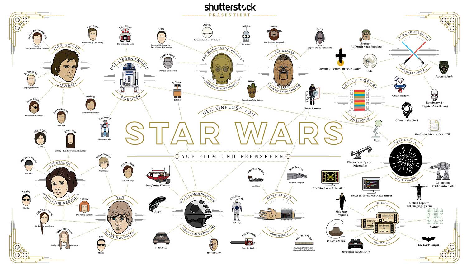 Bevor Ende des Jahres Star Wars: Episode VII – Das Erwachen der Macht in die deutschen Kinos kommt, hat Shutterstock das Star Wars Imperium und dessen Bedeutung einmal genauer untersucht. Die aktuelle Infografik von Shutterstock zeigt den Einfluss dieses Klassikers auf andere Filme und TV-Serien und veranschaulicht eindrucksvoll, wie viele Filme von George Lucas’ Lebenswerk inspiriert wurden.