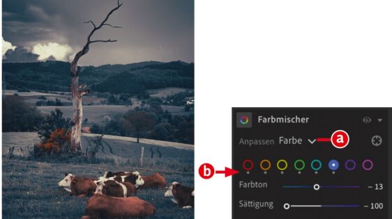 Foto: Olaf Giermann Dank kleiner grauer Punkte sehen Sie beim »Farbmischer« in Lightroom Classic sofort, in welchem Bereich Sie Änderungen vorgenommen haben. Im Modus »Farbe« (a) lassen sich die acht vorgegebenen Farbbereiche Bildschirmplatz sparend optimieren. Geänderte Bereiche werden durch einen grauen…