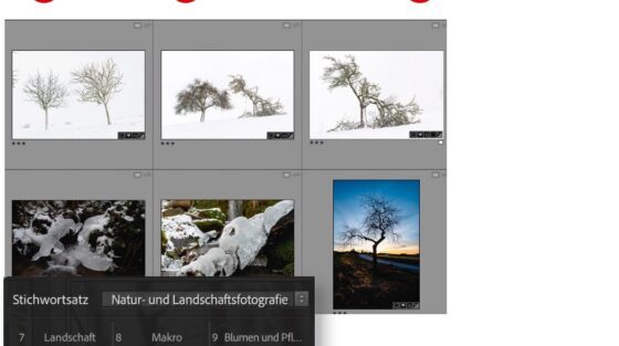 In Lightroom Classic ist die Sprühdose das Werkzeug der Wahl, um schnell einzelne Bilder oder ganze Serien mit den gleichen Stichwörtern zu versehen. Aktivieren Sie die Sprühdose (a) in der Werkzeugleiste, wählen Sie für »Malen« den Modus »Stichwörter« (b) und geben Sie die …