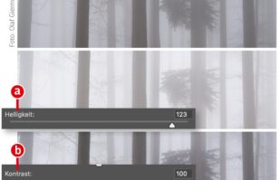 13 Helligkeit/Kontrast Die Bezeichnung dieser Korrektur verdeutlicht bereits deren Funktion. „Helligkeit“ hellt die Mitteltöne auf (a) oder dunkelt sie ab. Der „Kontrast“-Regler funktioniert wie eine S-förmige »Gradationskurve« und erhöht, …