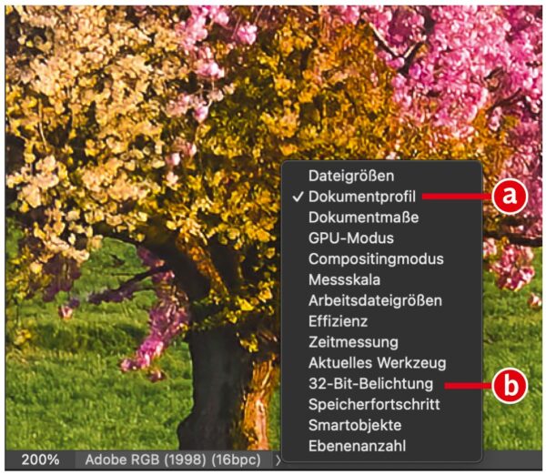 Im Dokumentfenster unten links wird standardmäßig die aktuelle Ansichtsgröße angezeigt. Rechts davon steht Ihnen eine Auswahl an einblendbaren Informationen zur Verfügung. Sinnvoll ist aus meiner Sicht insbesondere die Anzeige des Dokumentprofils, um es bei einem durchgängigen Farbmanagement immer im Blick zu haben (a). Bei HDR-Bildern mit 32-Bit-Farbtiefe ist die Option »32-Bit-Belichtung« (b) praktisch, die per Schieberegler eine Helligkeitsanpassung der Bildanzeige erlaubt. Fast alle Optionen lasen sich auch in der »Info«-Palette anzeigen.
