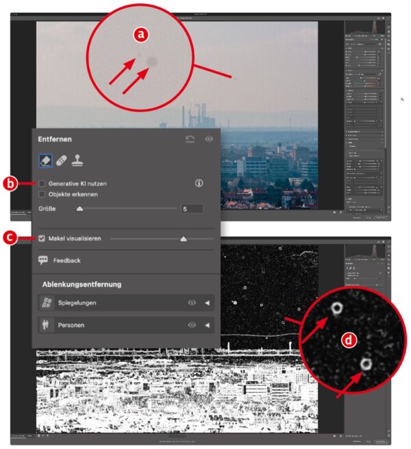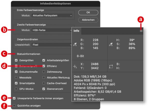 »Fenster > Info« öffnet das Info-Panel, dessen Standardkonfiguration wenig nützlich ist. In den »Infobedienfeldoptionen« (a) ändern Sie das. Ich empfehle, die »Zweite Farbwertanzeige« auf Ihren bevorzugten Farbmodus einzustellen (b) und unter den »Statusinformationen« (c) nur die für Sie relevanten Optionen zu aktivieren. So zeigt etwa die »Effizienz« (d) an, ob geöffnete Dateien vollständig im Arbeitsspeicher verwaltet werden können oder Speicherplatz einer Festplatte oder SSD genutzt wird – eine wertvolle Information, um Performance-Einbrüche einschätzen zu können. Praktisch ist auch die Option »Unseparierte Farbwerte immer anzeigen« (e), die für Übersichtlichkeit sorgt, indem sie für Farb- und Tonwertkorrekturen über Einstellungsebenen statt Vorher/Nachher-Werten nur das Resultat anzeigt. »Quickinfos anzeigen« (f) können Sie getrost deaktivieren, da die Option auch für blutige Anfänger bei keinem aktiven Werkzeug irgendeine nützliche Information liefert.