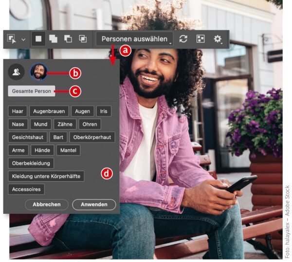 Das Objektauswahl-Werkzeug hat eine Personenerkennung erhalten, wie Sie sie vielleicht schon aus dem Maskierungsbereich von Camera Raw oder Lightroom kennen. Durch einfaches Anklicken im Bild wählen Sie in Photoshop nach einer kurzen Bildanalyse Personen oder deren visuelle Komponenten aus – wie etwa Haut, Haare, Gesichtsdetails, Kleidung und Accessoires. Alternativ klicken Sie in der Optionsleiste auf »Personen auswählen« (a), dann auf die Miniaturvorschau (b) der Person und anschließend auf »Gesamte Person« (c) oder auf die Komponenten (d), für die Sie eine Auswahl erzeugen möchten.