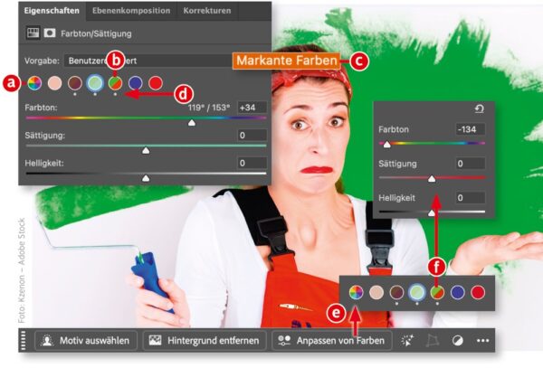 Tipp: »Markante Farben« lassen sich auch im Dropdown-Menü einer bereits erzeugten »Farbton/Sättigung«-Einstellungsebene zur KI-basierten Definition der dominanten Farbbereiche eines Bildes wählen (c).