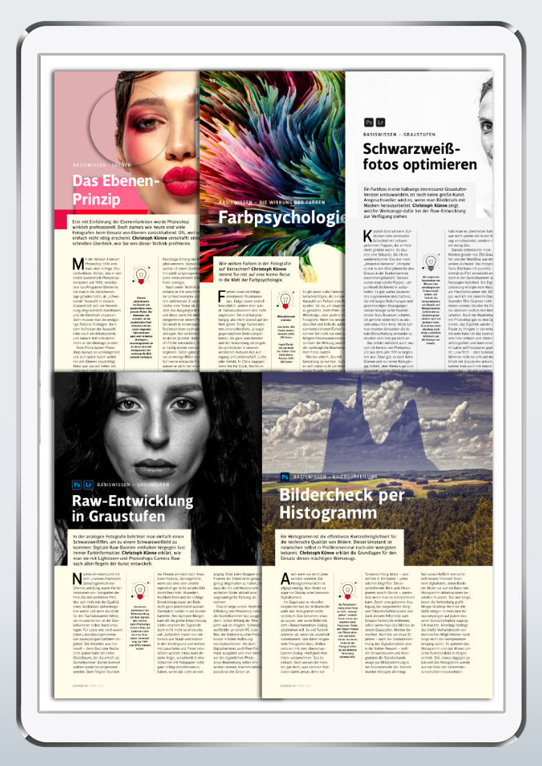 Ein Histogramm ist die effektivste Kontrollmöglichkeit für die technische Qualität von Bildern. Doch neigen immer noch viele Fotografen dazu, Bildkorrekturen mit dem überschaubareren Dialog »Helligkeit/ Kontrast« vorzunehmen. Das ist einfach. Doch wissen die meisten gar nicht, was sie ihren Bilddaten damit antun, denn der Tonwertumfang leidet – speziell bei 8-Bit-Daten. Durch eine gekonnte Auslegung der dargestellte Berg und Tallandschaften lassen sich dank Histogramm zum Beispiel Farbstiche entfernen, selbst wenn man das Bild nur an einem Graustufen-Monitor betrachtet. ePaper, 6 Seiten. Mehr erfahren