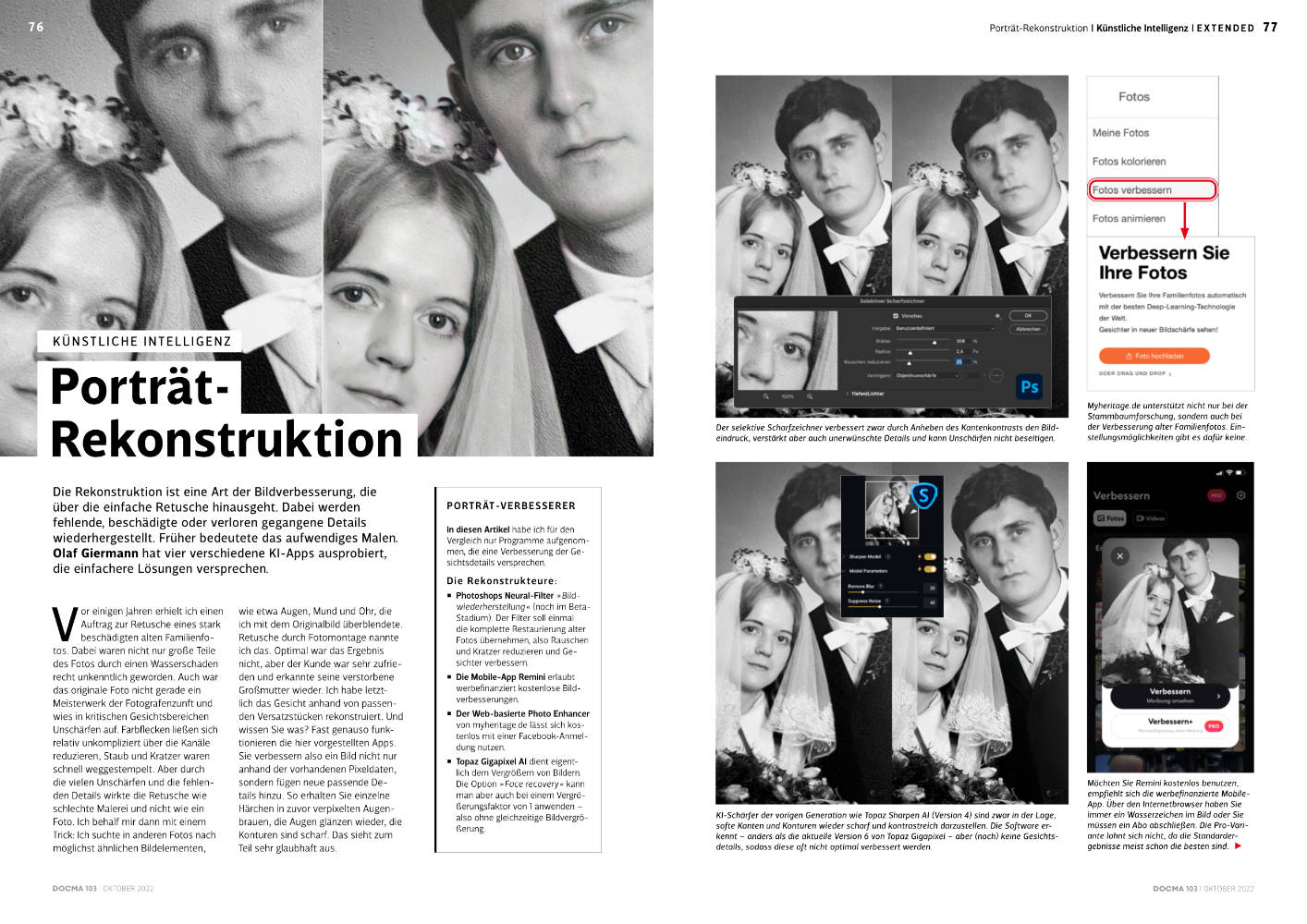 • Porträt-Rekonstruktion   Bei der Bildrekonstruktion werden beschädigte oder fehlende Details meist durch Malen wiederhergestellt. Die von Olaf Giermann vorgestellten KI-Apps versprechen einfachere und bessere Lösungen.