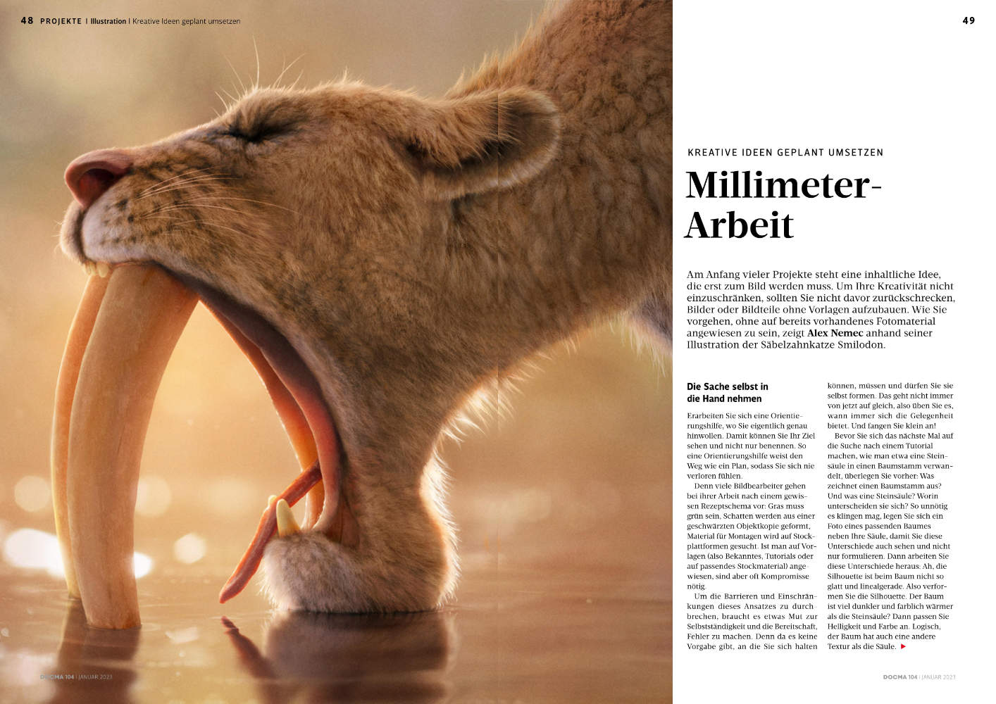 • Millimeter-Arbeit  Alex Nemec beschreibt die Entstehungsschritte seiner „Säbelzahnkatze Smilodon“ – von der Idee und Recherche über eine Kompositionsskizze und die Materialbeschaffung bis zur finalen Ausarbeitung.