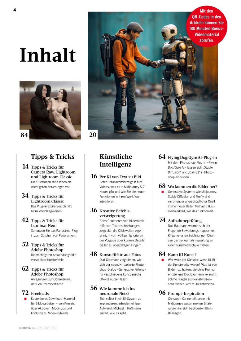 Top-Themen: KI-Funktionen in Photoshop, Lightroom und Lightroom Classic | Kann KI Kunst?  | KI-Bilder aus einem Guss | Gratis Freeloads und Templates | Bonus: 180 Min. Video-Tutorials | 100 Seiten + Videoanleitungen + Arbeitsmaterial.