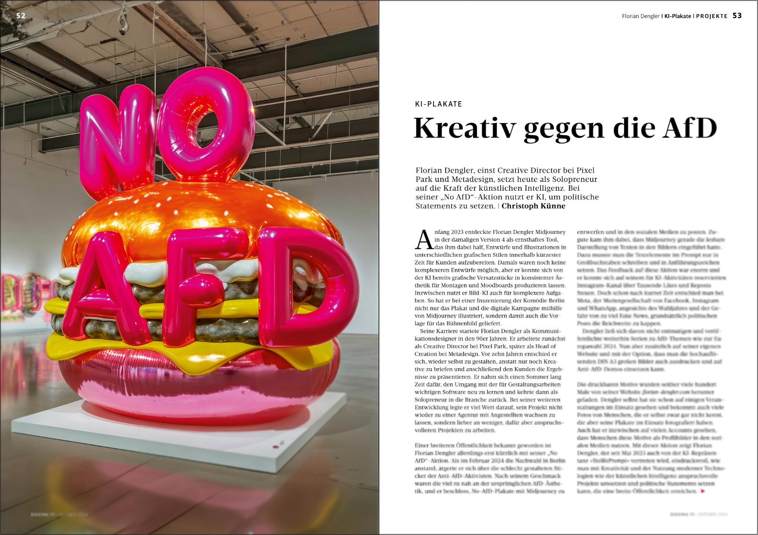 - Kreativ gegen die AfD Florian Dengler, einst Creative Director bei Pixel Park und Metadesign, setzt heute als Solopreneur auf die Kraft der künstlichen Intelligenz. Bei seiner „No AfD“-Aktion nutzt er KI für politische Statements.