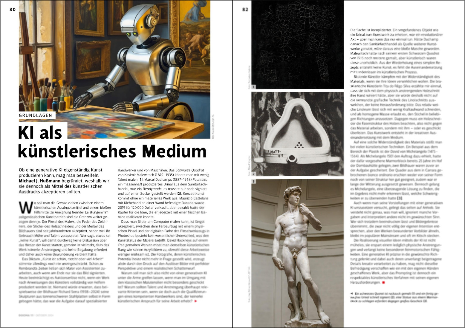 - KI als künstlerisches Medium Michael J. Hußmann begründet, weshalb wir KI als Mittel des künstlerischen Ausdrucks akzeptieren sollten, obwohl sie eigenständig keine Kunst produzieren kann.