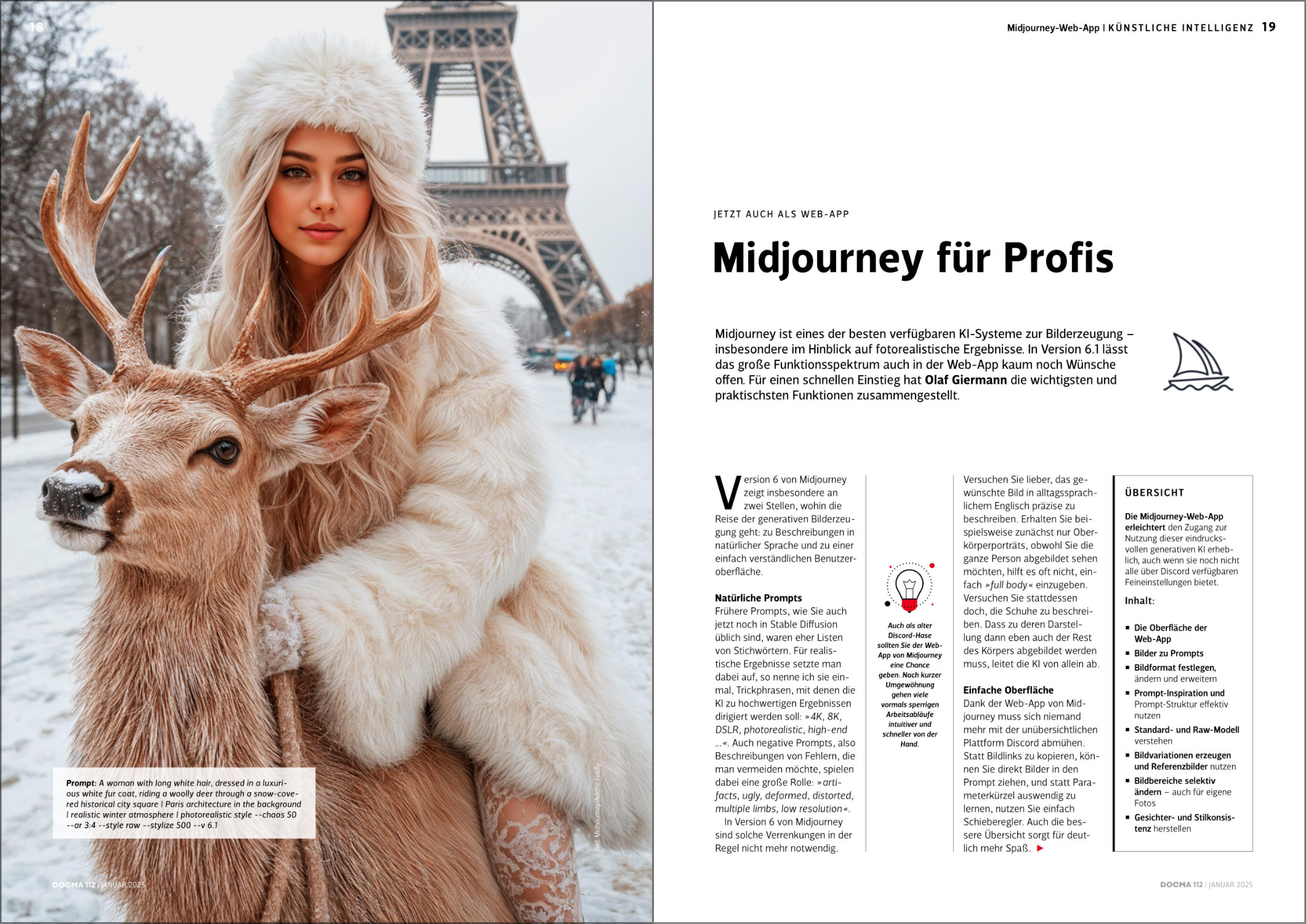 • Midjourney für Profis  Midjourney ist eines der besten verfügbaren KI-Systeme zur Bilderzeugung. In Version 6.1 lässt das große Funktionsspektrum auch in der Web-App kaum noch Wünsche offen. Olaf Giermann erklärt die wichtigsten und praktischsten Funktionen.