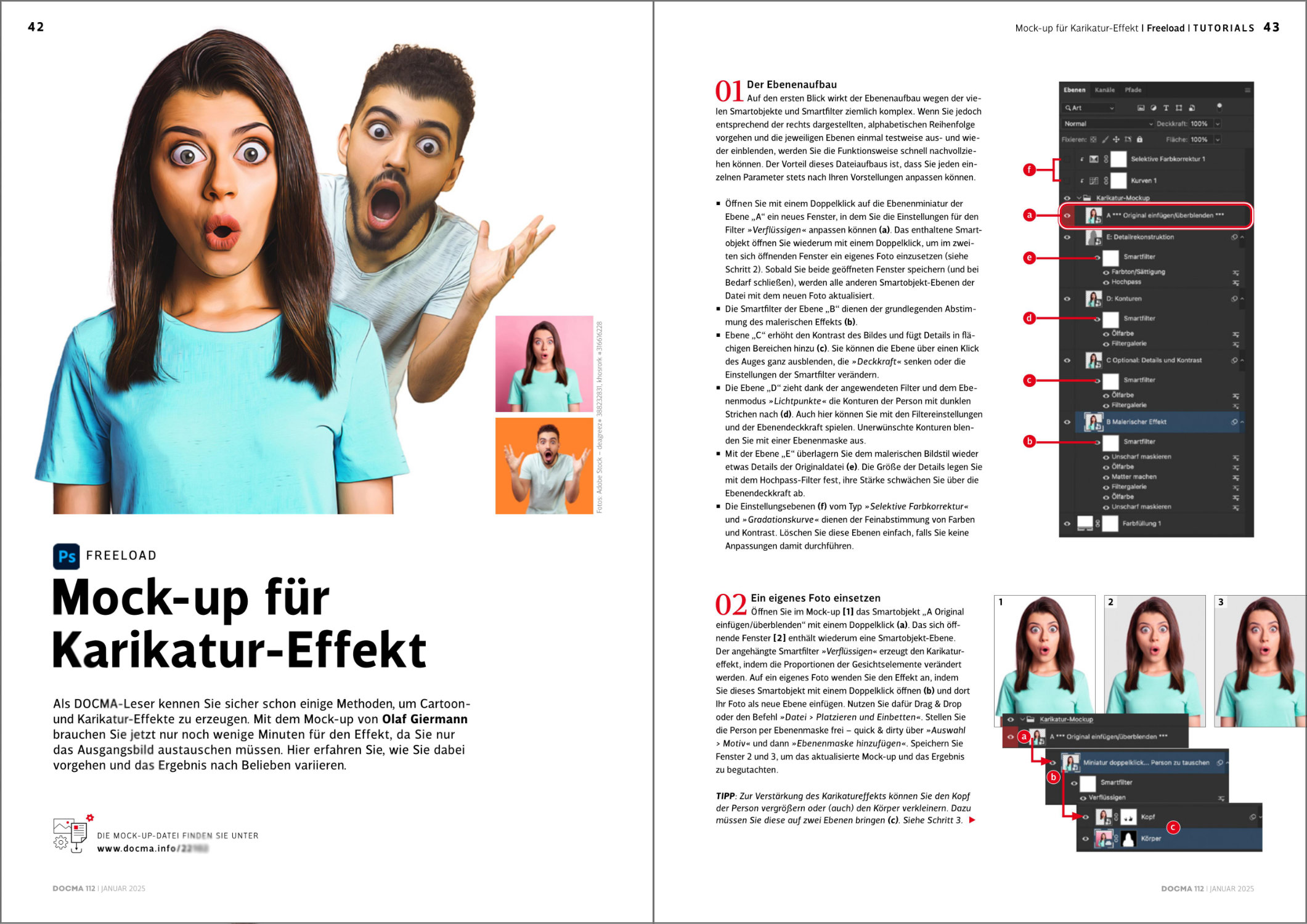 • Mock-up für Karikatur-Effekt  Mit dem kostenlosen Mock-up von Olaf Giermann machen Sie in wenigen Minuten aus einem eigenen Foto eine Karikatur.