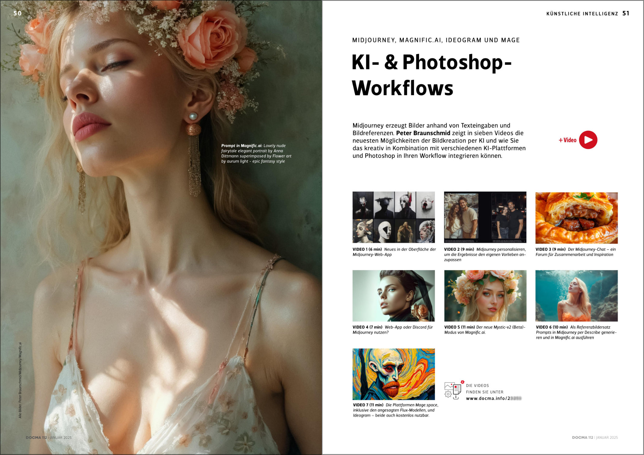 • KI- und Photoshop-Workflows  Peter Braunschmid zeigt in sieben Videos die neuesten Möglichkeiten der Bildkreation per KI und wie Sie diese kreativ in Kombination mit verschiedenen KI-Plattformen und Photoshop in Ihren Workflow integrieren können.